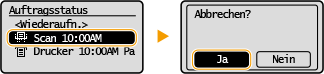 Die Originale wurden gescannt und sind zur Verarbeitung bereit. Wählen Sie das Dokument aus, dessen Vorgang abgebrochen werden soll, und wählen Sie <Ja>.