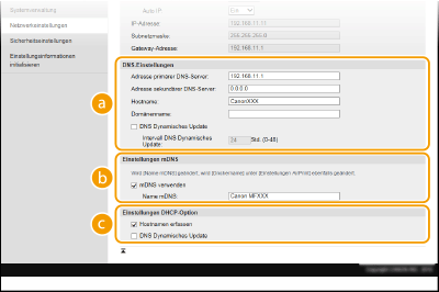 Aktivieren Sie das Kontrollkästchen, wenn die DNS-Datensätze dynamisch aktualisiert werden sollen, sobald sich die IP-Adresse des Geräts ändert. Aktivieren Sie das Kontrollkästchen [Manuelle Adresse registrieren], [Zustandshafte Adresse registrieren] oder [Zustandslose Adresse registrieren], je nachdem, welche Art oder Arten von Adressen beim DNS-Server registriert werden sollen. Wenn die Aktualisierungen in einem festen Intervall erfolgen sollen, geben Sie dieses in Stunden in das Textfeld [Intervall DNS Dynamisches Update] ein.