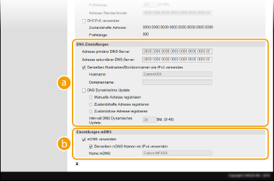 Aktivieren Sie das Kontrollkästchen, wenn Sie denselben mDNS-Namen wie bei IPv4 verwenden möchten. Wenn Sie einen anderen Namen festlegen möchten, deaktivieren Sie das Kontrollkästchen, und geben Sie den mDNS-Namen in das Textfeld [Name mDNS] ein.