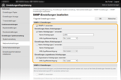 Sie können auch über den Bildschirm <Menü> SNMPv1-Einstellungen angeben und SNMPv3-Einstellungen aktivieren oder deaktivieren. <SNMP-Einstellungen>