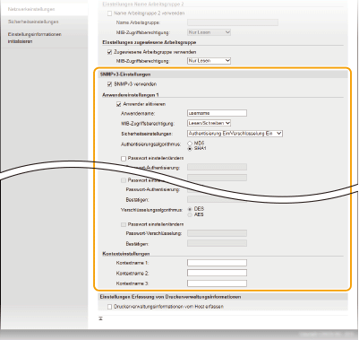SNMP (Simple Network Management Protocol) ist ein Protokoll zum Überwachen und Steuern von Kommunikationsgeräten in einem Netzwerk über die MIB (Management Information Base). Das Gerät unterstützt SNMPv1 und das mit Sicherheitsmechanismen ausgestattete SNMPv3. Sie können den Status des Geräts von einem Computer aus anzeigen, wenn Sie Dokumente drucken oder Remote UI verwenden. Sie können SNMPv1 oder SNMPv3 oder beide Versionen gleichzeitig aktivieren. Legen Sie die Einstellungen für jede Version je nach Netzwerkumgebung und Verwendungszweck fest.