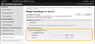 ![]() Brug af kontrolpaneletDer er også adgang til indstillinger for PIN til adgang til Fjern-UI fra <Menu> på skærmbilledet Hjem. <Indstillinger for Fjern-UI>