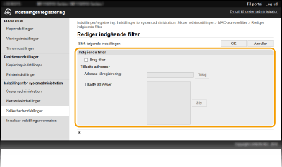 Hvis MAC-adresserne er indtastet forkert, kan du muligvis ikke få adgang til maskinen fra Fjern-UI. I dette tilfælde skal du angive <MAC-adressefilter> til <Fra>. <MAC-adressefilter>