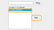 Indtast MAC-adressen i tekstfeltet [Adresse til registrering], og klik på [Tilføj]. Tillader kun kommunikation (modtaget) med enheder, hvis MAC-adresser er registreret, og begrænser kommunikation med enheder med andre MAC-adresser.