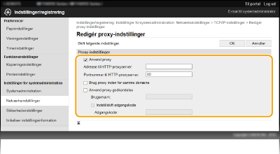 Du kan angive eller ændre adgangskoden for proxygodkendelse, når den er aktiveret, ved at markere afkrydsningsfeltet og indtaste alfanumeriske tegn for den nye adgangskode i tekstfeltet [Adgangskode].
