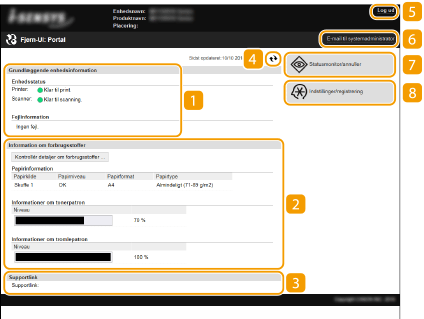 Når du logger ind på Fjern-UI, vises følgende portalside. I dette afsnit beskrives de emner, der vises på portalsiden og de grundlæggende handlinger.