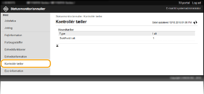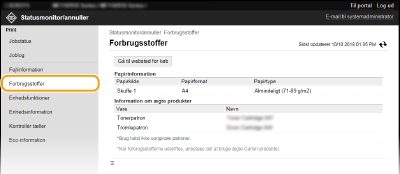 Papirformat og papirtype for papirkilde, modelnummer for tonerpatronen etc. vises. Du kan også klikke på [Kontrollér detaljer om forbrugsstoffer] på portalsiden (hovedsiden) for at få vist denne side (