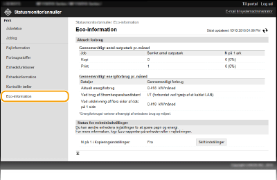 Du kan kontrollere oplysninger som f.eks. antallet af udskrifter pr. måned, og hvor meget strøm der er brugt. Du kan også kontrollere og ændre enhedens indstillinger for kopiering for at spare papir og energi.
