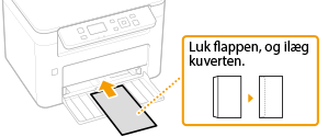 Ilæg kuverterne Monarch, No. 10 (COM10), DL eller C5 i stående retning (med de korte kanter mod maskinen), så siden uden lim vender opad (forsiden). Du kan ikke udskrive på den modsatte side af kuverter.