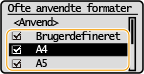 Du kan sørge for, at det kun er ofte anvendte papirformater, der vises på skærmen <Ofte anvendte formater>, hvor du skal vælge indstilling for papirformat.