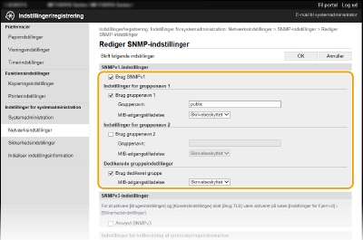 Hvis begge SNMP-versioner er aktiveret, anbefales det, at MIB-adgangstilladelse i SNMPv1 angives til [Skrivebeskyttet]. MIB-adgangstilladelsen kan indstilles uafhængigt i SNMPv1 og SNMPv3 (og for hver bruger i SNMPv3). Hvis [Læs/skriv] (fuld adgangstilladelse) vælges i SNMPv1, negerer det de robuste sikkerhedsfunktioner, der er et kendetegn ved SNMPv3, fordi de fleste af maskinindstillingerne så kan kontrolleres med SNMPv1.