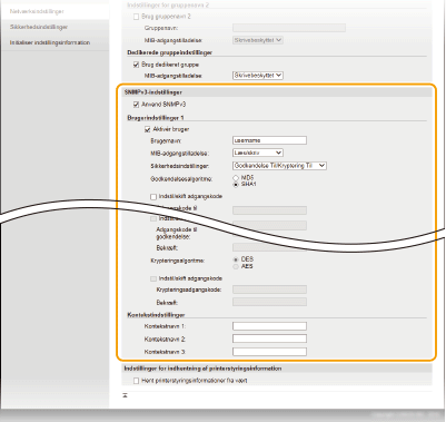 SNMP (Simple Network Management Protocol) er en protokol til overvågning og styring af kommunikationsenheder på et netværk ved hjælp af MIB (Management Information Base). Maskinen understøtter SNMPv1 og den sikkerhedsudvidede SNMPv3-udgave. Du kan kontrollere statussen på maskinen fra en computer, når du udskriver dokumenter eller bruger Fjern-UI. Du kan aktivere enten SNMPv1 eller SNMPv3 eller begge på samme tid. Angiv indstillingerne for hver version, så de passer til dit netværksmiljø og anvendelsens formål.