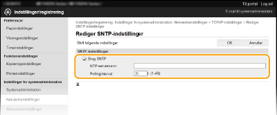 Marker afkrydsningsfeltet [Brug SNTP], og angiv de påkrævede indstillinger.