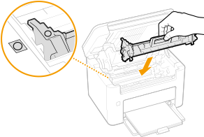 ![]() ![]() Undgå at ryste eller vippe tonerpatronen. Sørg også for, at tonerpatronen ikke får nogle stød ved, at den f.eks. slås mod noget. Hvis den får et stød, kan det få toneren til at lække. Fjern tonerpatronen forsigtigt i samme vinkel som åbningen.