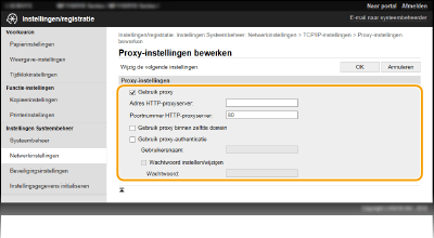 Als u het wachtwoord voor proxyverificatie wilt instellen of wijzigen, schakelt u het selectievakje in en typt u alfanumerieke tekens voor het nieuwe wachtwoord in het vak [Wachtwoord].
