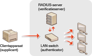 De machine kan als een clientapparaat worden aangesloten op een 802.1X-netwerk. Een doorsnee 802.1X-netwerk bestaat uit een RADIUS-server (verificatieserver), een LAN-switch (authenticator) en clientapparaten met verificatiesoftware (supplicants). Als een apparaat probeert verbinding te maken met het 802.1X-netwerk, moeten de gebruikersgegevens worden geverifieerd om er zeker van te zijn dat de verbinding tot stand wordt gebracht door een bevoegde gebruiker. Hiertoe worden verificatiegegevens verzonden naar en gecontroleerd door een zogenaamde RADIUS-server, die op basis van het verificatieresultaat communicatie met het netwerk toestaat of weigert. Als de verificatie mislukt, wordt de externe toegang tot het netwerk geblokkeerd door een LAN-switch (of een toegangspunt).