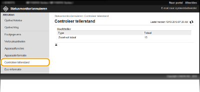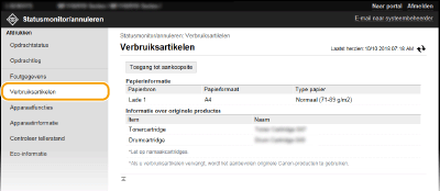 Het papierformaat en de papiersoort voor de papierbron, het modelnummer van de tonercartridge, enz. worden weergeven. U kunt deze pagina ook weergeven door op [Details verbruiksartikelen controleren] in de portalpagina (hoofdpagina) te klikken (