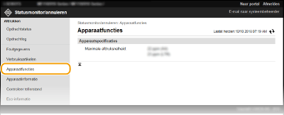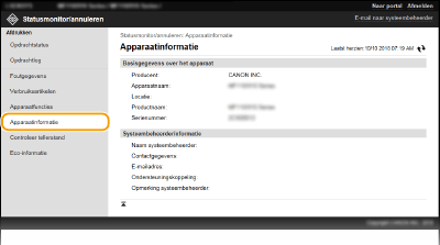 Hier ziet u informatie over het apparaat en de systeembeheerder. Deze informatie is ingesteld in [Systeembeheer] op de pagina [Instellingen/registratie].
