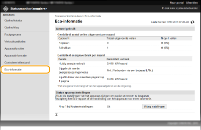 Hiermee kunt u informatie controleren, zoals het aantal afdrukken per maand en het stroomverbruik. Daarnaast kunt u de kopieerinstellingen controleren en wijzigen om papier en stroom te besparen.