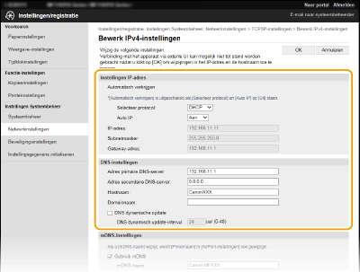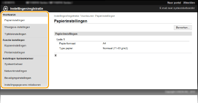 U kunt verschillende instellingen van het apparaat wijzigen met de externe UI. De meeste instellingen kunnen ook via het bedieningspaneel van het apparaat worden gewijzigd, maar sommige instellingen kunt u alleen wijzigen via de externe UI. Dit gedeelte beschrijft de basisprocedure voor het veranderen van de instelling van het apparaat met behulp van de externe UI.