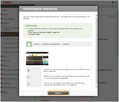 Als u op het pictogram klikt, kan de huidige pagina donker worden en kan een uitklapvenster verschijnen. Om terug te keren naar de pagina, klikt u op [Sluiten] in het uitklapvenster.