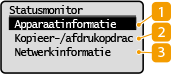 Wanneer u <Statusmonitor> selecteert, wordt er een scherm weergegeven waarin u de voortgang kunt controleren van documenten, en ook de status van het apparaat (resterende hoeveelheid toner in de tonercartridge, enzovoort) en netwerkinstellingen, zoals het IP-adres van het apparaat.