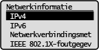 Geeft de netwerkinstellingen zoals het IP-adres van het apparaat weer en de status zoals de staat van de draadloze LAN-communicatie.