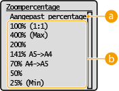 U kunt kopieën vergroten of verkleinen door een vooraf ingesteld zoompercentage te gebruiken zoals <A5->A4> of door in stappen van 1% een aangepast zoompercentage in te stellen.