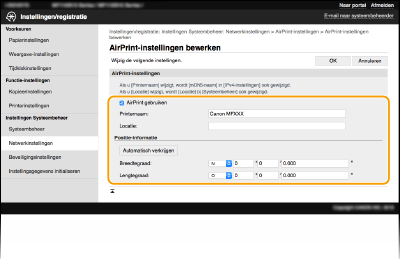 Hiermee kunt u de waarden controleren die zijn ingevoerd in de AirPrint-instellingen, zoals de naam en locatie van het apparaat. U kunt op [Bewerken] klikken om de instellingen te veranderen.