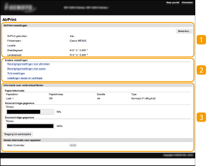 Wanneer u zich met beheerdersrechten aanmeldt, verschijnt de pagina met AirPrint-informatie, zoals hieronder weergegeven.
