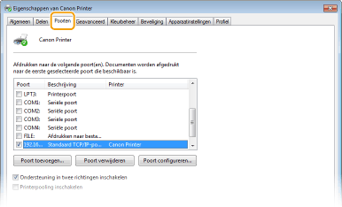 ![]() U kunt een MFNP-poort uitsluitend toevoegen als u het stuurprogramma van de meegeleverde CD-ROM/DVD-ROM hebt geïnstalleerd, of als u het printerstuurprogramma van de website van Canon hebt gedownload en geïnstalleerd.