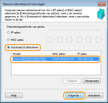 Selecteer [Automatische detecteren], selecteer het apparaat als dit is gevonden en klik op [Volgende].