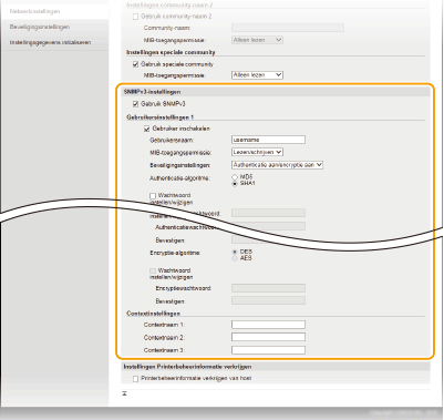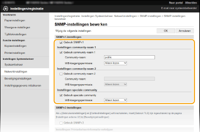 SNMP (Simple Network Management Protocol) is een protocol voor het bewaken en aansturen van communicatieapparaten in een netwerk dat werkt met MIB (Management Information Base). De machine ondersteunt SNMPv1, en SNMPv3 met extra beveiliging. U kunt de status van de machine controleren vanaf een computer wanneer u documenten afdrukt of de externe UI gebruikt. U kunt SNMPv1 of SNMPv3 inschakelen, of beide versies tegelijk. Geef voor elke versie de instellingen op die aansluiten bij de inrichting en functie van uw netwerkomgeving.