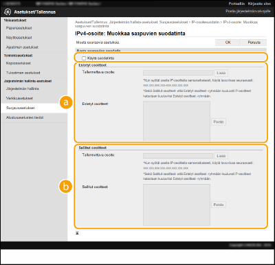 Voit joko rajoittaa tiedonsiirron vain määritetyissä IP-osoitteissa oleviin laitteisiin tai estää laitteet tietyistä IP-osoitteista ja sallia muun tiedonsiirron. Voit määrittää yksittäisen IP-osoitteen tai IP-osoitealueen.