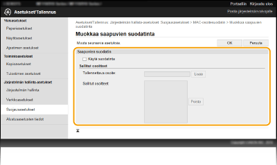 Jos MAC-osoitteet on syötetty väärin, et ehkä pysty käyttämään laitetta etäkäyttöliittymästä, missä tapauksessa <MAC-osoitesuodatin>-asetukseksi täytyy valita <Ei>. <MAC-osoitesuodatin>