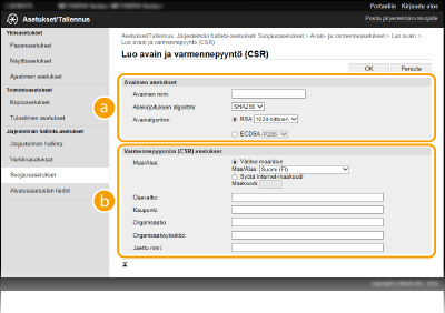 Koska laitteella luoduilla varmenteilla ei ole CA-allekirjoitusta, seurauksena voi olla tiedonsiirtovirhe laitteiden, joiden kanssa se siirtää tietoja, mukaan. Jotta varmenteen myöntäjä voisi myöntää CA-allekirjoituksen sisältävän varmenteen, sinun täytyy hankkia varmenteen allekirjoituspyynnön (CSR) tiedot, jotka pääkäyttäjä voi luoda Etäkäyttöliittymästä. Kun varmenne myönnetään, tallenna se avaimeen luodun CSR:n kanssa.
