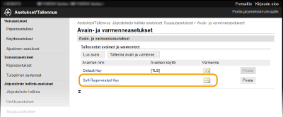 Avainta ja varmennetta ei voi poistaa, jos ne ovat käytössä, esimerkiksi kun "[TLS]" näkyy kohdassa [Avaimen käyttö]. Poista tällöin toiminto käytöstä tai vaihda avain ja varmenne ennen poistamista.