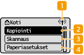 <Valikko><Verkkoasetukset>, <Yleisasetukset> ja monet muut laitteen asetukset aloitetaan tästä kohdasta. Asetusvalikkoluettelo