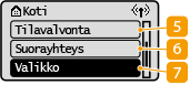 <Tilavalvonta>Valitse tämä kohta, kun haluat tarkistaa tulostuksen tilan, näyttää käyttöhistorian tai näyttää verkkoasetukset, kuten laitteen IP-osoitteen. Voit myös tarkistaa laitteen tilan, kuten väriainekaseteissa jäljellä olevat määrät jne. tai mahdollisesti tapahtuneet virheet. <Tilavalvonta>-näyttö