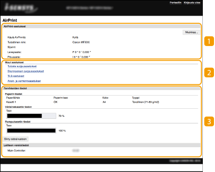 Voit ottaa AirPrintin skannaustoiminnon käyttöön/pois käytöstä. Oletusasetus on <Kyllä>.