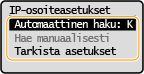 Varmista, että <Automaattinen IP> -asetuksena on <Kyllä>.