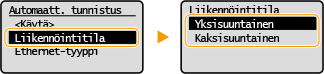 Tietoja lähetetään ja vastaanotetaan vuorotellen. Valitse tämä, kun laite on yhdistetty verkkoon yksisuuntaisessa tilassa. <Kaksisuuntainen>