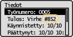 Jos tapahtuu virhe, esimerkiksi tulostus ei onnistu, vastaava virhekoodi näytetään työlokinäytössä kolminumeroisena lukuna. Etsi kunkin virhekoodin syyt ja ratkaisut alta. Katso lisätietoja työlokinäytöstä kohdasta