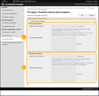 При неправильном вводе IP-адресов доступ к аппарату с Удаленным ИП может быть заблокирован. В этом случае необходимо установить для параметра <Фильтр IPv4-адресов> или <Фильтр IPv6-адресов> значение <Выкл.>. <Фильтр IPv4-адресов> <Фильтр IPv6-адресов>