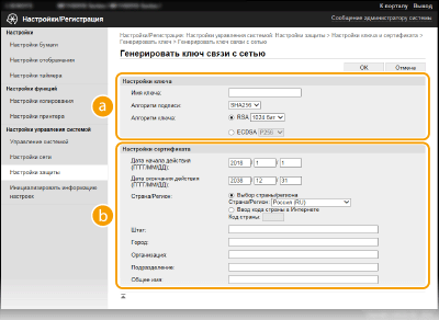 Если значение [SHA384] или [SHA512] выбрано в поле [Алгоритм подписи], невозможно выбрать значение [512 бит] в качестве длины ключа, если значение [RSA] выбрано в поле [Алгоритм ключа].
