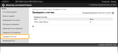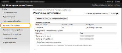 Отображение формата и типа бумаги для источника бумаги, номера модели картриджа с тонером и других сведений. Для отображения этой страницы можно также нажать кнопку [Проверить сведения о расходных материалах] на странице портала (главной странице) (