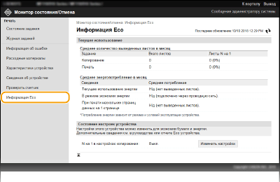 Можно проверить такую информацию, как количество отпечатков в месяц и количество потребленной электроэнергии. Кроме того, вы можете проверить и изменить настройки печати в аппарате для экономии бумаги и энергии.