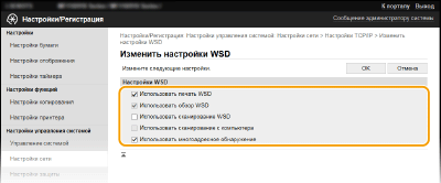 Установите флажок, чтобы разрешить печать по протоколу WSD. Если печать по протоколу WSD не используется, снимите флажок. [Использовать обзор WSD]