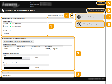 När du loggar in till gränssnittet för fjärranvändning öppnas följande portalsida. Det här avsnittet beskriver objekten som visas på portalsidan samt grundläggande funktioner.