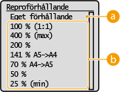 Du kan förstora eller förminska kopior genom att använda ett förinställt reproförhållande, till exempel <A5->A4>, eller genom att ställa in en anpassat reproförhållande i steg om 1 %.